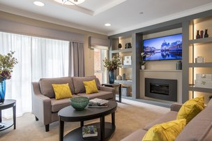 Accommodation includes stylish en-suite bedrooms and a choice of contemporary private suites, each with a kitchenette, lounge-diner, and patio overlooking the gardens. Leisure and relaxation are supported with a deluxe cinema, an activity lounge, and inviting balconies offering beautiful views. The Wellness Suite provides gentle exercise programmes tailored to each person’s ability, encouraging holistic wellbeing. Each floor also features welcoming social spaces where residents can enjoy company or retreat to a quiet corner, ensuring comfort and choice every day.